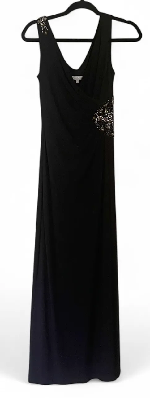 Elegant black floor-length gown, crafted in a sleek stretch fabric with hand-embellished beaded detailing at the waist and shoulder. Features a deep V-neck, front slit opening, and gathered draping that flatters the figure beautifully. Condition: Excellent – only tried on, never worn out. (Note: a few loose threads at the waist embellishment area, easily repairable and not noticeable when worn.) Size: 36 (fits like a US Small) Measurements (approx.): • Bust (pit to pit): 16 in • Waist: 13 in • Length: ~54 in • Material: 62% viscose, 35% polyester, 3% spandex Care: Dry clean only #EveningGown #BlackDress #FormalDress #BeadedGown #MaxiDress #OccasionWear #GalaDress #ElegantStyle #EmbellishedDress A few loose threads at the waist embellishment area, easily repairable and not noticeable when worn.