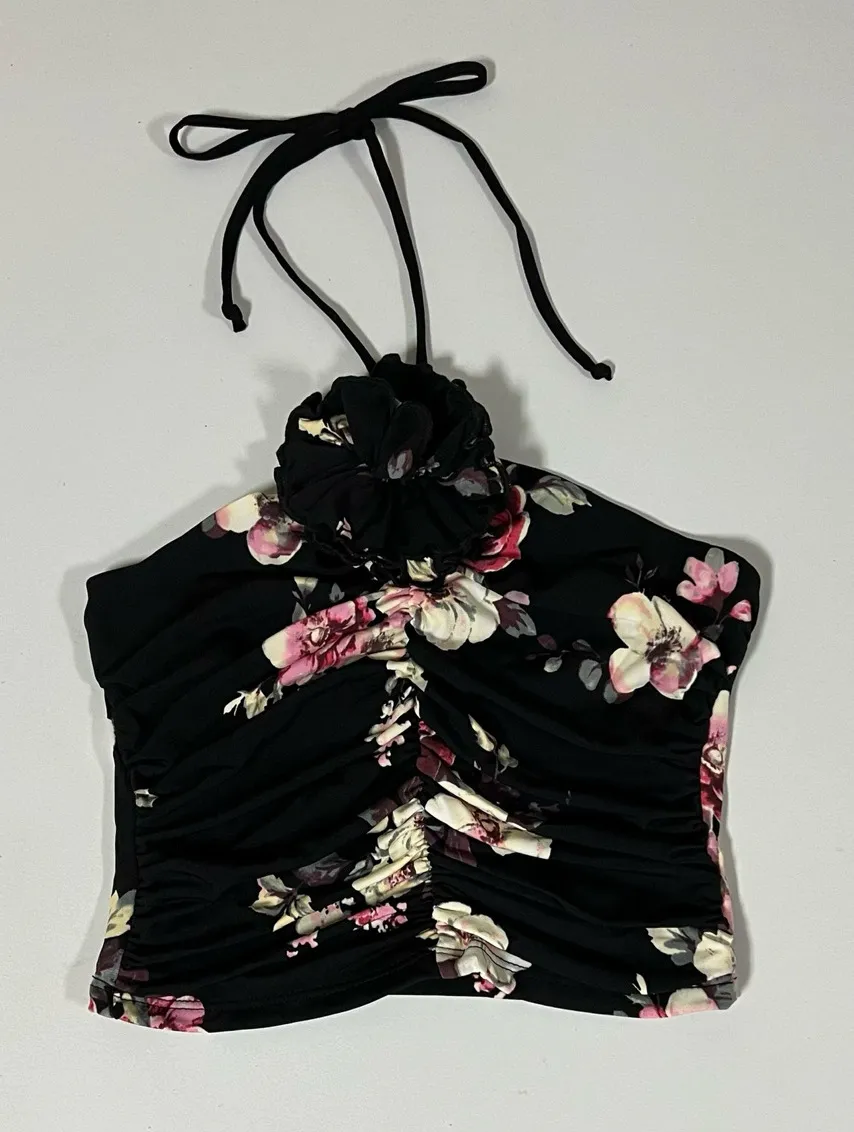 Black ‘Fame Time’ Flower Floral Ruched Halter Crop Top Shirt Blouse Size S 🌸 - $45 (30% Off Retail) - From faeriekiss