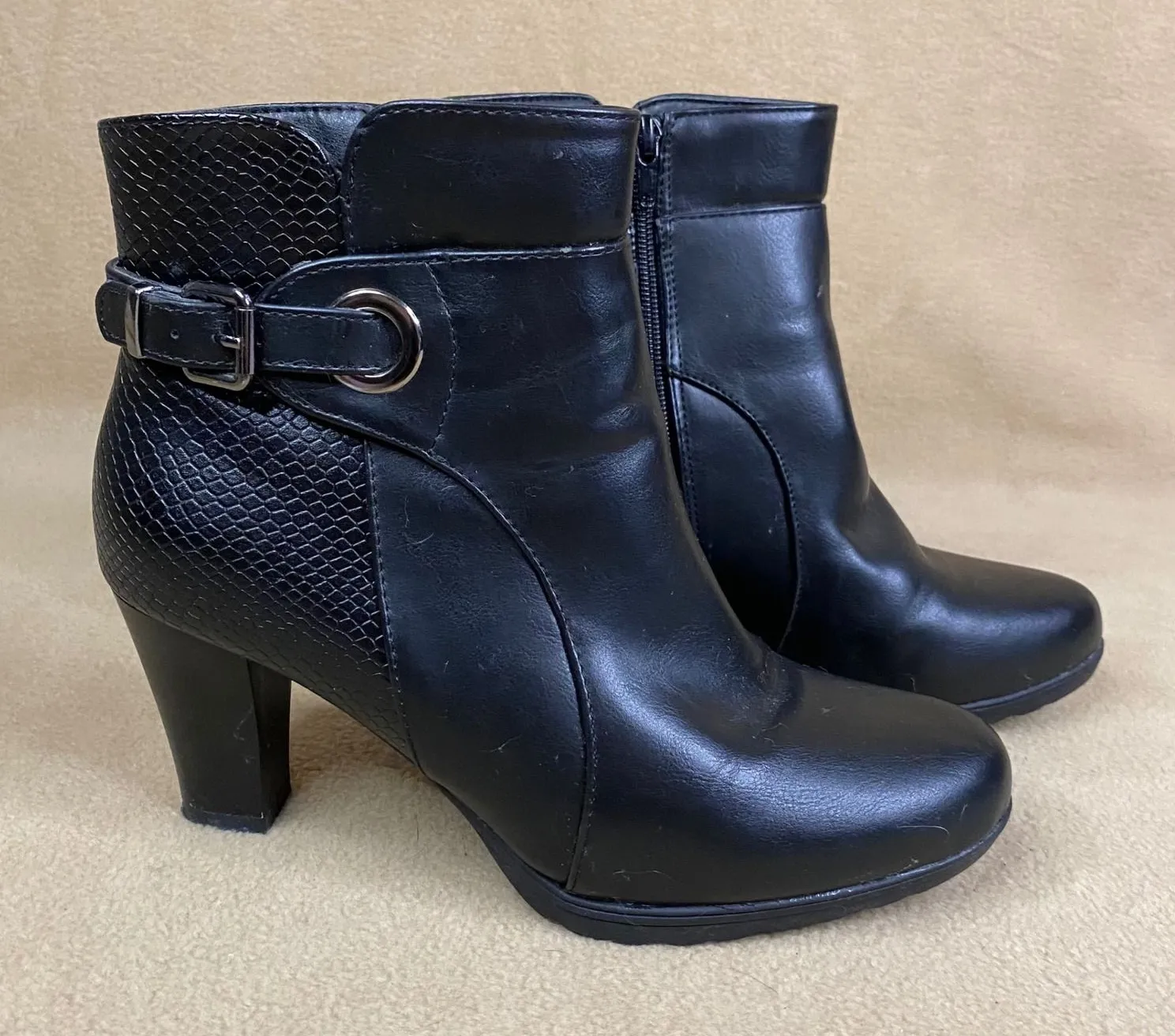 Condition: Excellent Used Condition Size: 9 Style: Bootie Department: Women Upper Material: Faux Leather Shoe Shaft Style: Ankle Insole Material: Synthetic Outsole Material: Rubber Heel Style: Block Heel Height: High (3-3.9 in) Occasion: Casual, Workwear, Party/Cocktail Toe Shape: Round Toe Type: Boot Features: Comfort, Lined, Straps, Buckle 387