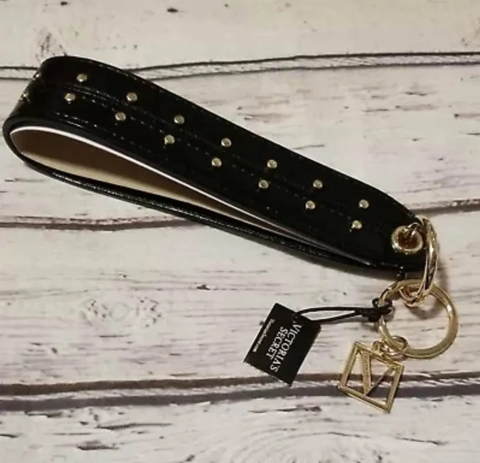 Chic black key holder with gold studs. Features a stylish wrist strap and signature charm. Ideal for... Show more