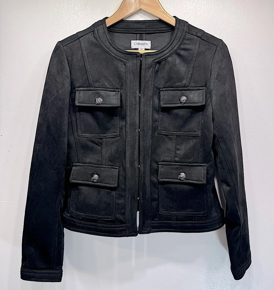 Carmen Marc Valvo Black Faux Suede Military Style Jacket. Four front flap pockets with metallic look decorative buttons. Four buttons on the cuffs of the long sleeves. Hook and eye front closure. Beautifully made, quality constructed jacket. TikTok trending piece! Women’s size small. Excellent preowned condition. Care/content tag has been removed. Clean, smoke free home and studio. Five star seller. Super fast shipping! Measurements 19” armpit to armpit 21” length *measurements are approximate SKU# 2451127 36