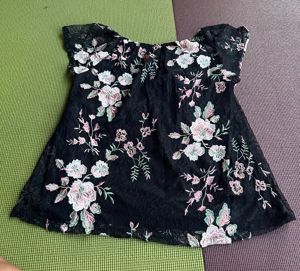 Black lace floral blouse. Very stretchy. Can be worn off the shoulder or not. Can fit a small too.