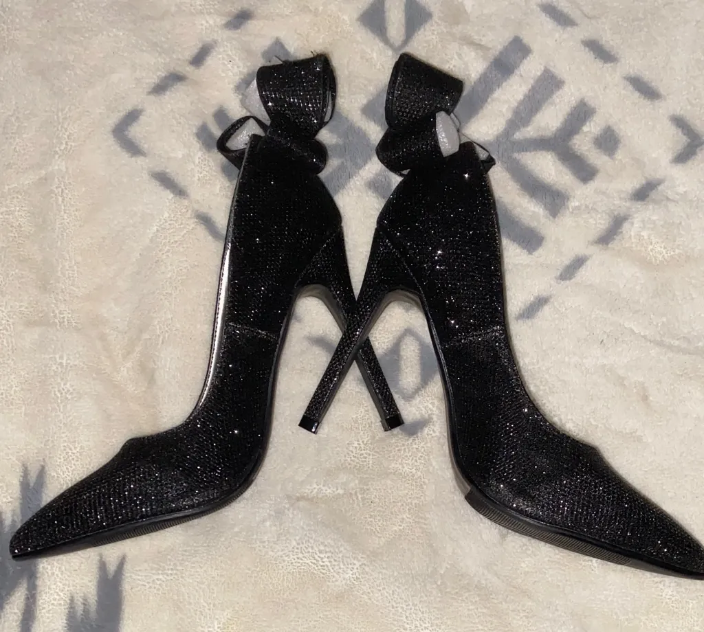 Absolutely stunning heels for that pop of unique style. Ruffled bows on the heels are a beautiful statement. Pair these with a simple little black dress or an evening gown. They would even work with a pencil skirt or suit at the office. Heels are 4”. Remove styrofoam before wearing. Price tag peeled a small strip on the footbed. Nonsmoking home and fast shipping.
