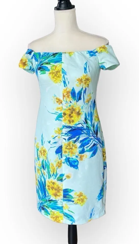 This Black halo dress is perfect for your daytime spring and summer events! it has a gorgeous floral print on a light cyan back drop. its fitted and knee length, with a flirty off the shoulder neckline. its in excellent condition - no flaws. - light blue cyan with floral print - knee length - made in USA - EUC Flat Measurements: Pit to pit: 16.5” Waist: 15” Hips: 20” Length (neckline to hem): 32 0610