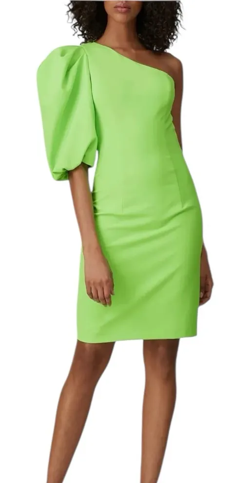 IN EXCELLENT PRELOVED CONDITION SIZE: 10 Turn heads in this vibrant Black Halo Cooper One-Shoulder Sheath Dress in striking neon lime green. A bold, modern silhouette with a sculpted fit that defines the waist and elongates the figure. • Elegant one-shoulder neckline with dramatic puff sleeve • Tailored bodycon sheath silhouette • Hidden side zip closure • Fully lined for a smooth, flattering fit • Made in the USA with imported materials Perfect for cocktail parties, weddings, or any event where you want to make a statement. Color: Neon Lime Fabric: 88% polyamide, 12% elastane Care: Dry clean only A standout style that channels confident, modern glamour. MEASUREMENTS: Bust: 17” Length: 40” ***all measurements are approximate