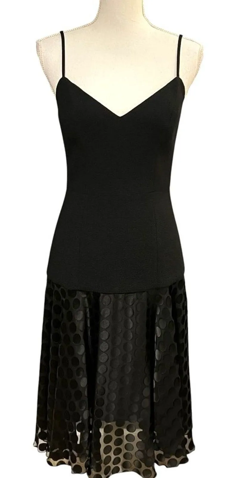 NWT Black Halo Womens Cocktail Dress Balerina Style Party Formal Wedding Guest Minimalist -Size 4 -New with Tags -See photos for measurements -Ballerina style silhouette -Pebble crepe fabric bust -V-Neckline -Spaghetti straps -Drop waist with polka dot chiffon skirt -Back hidden zipper closure Style tags: classic, sophisticated, formal, black tie, holiday, special occasion, cocktail, party, New Years Eve, wedding guest, minimalist
