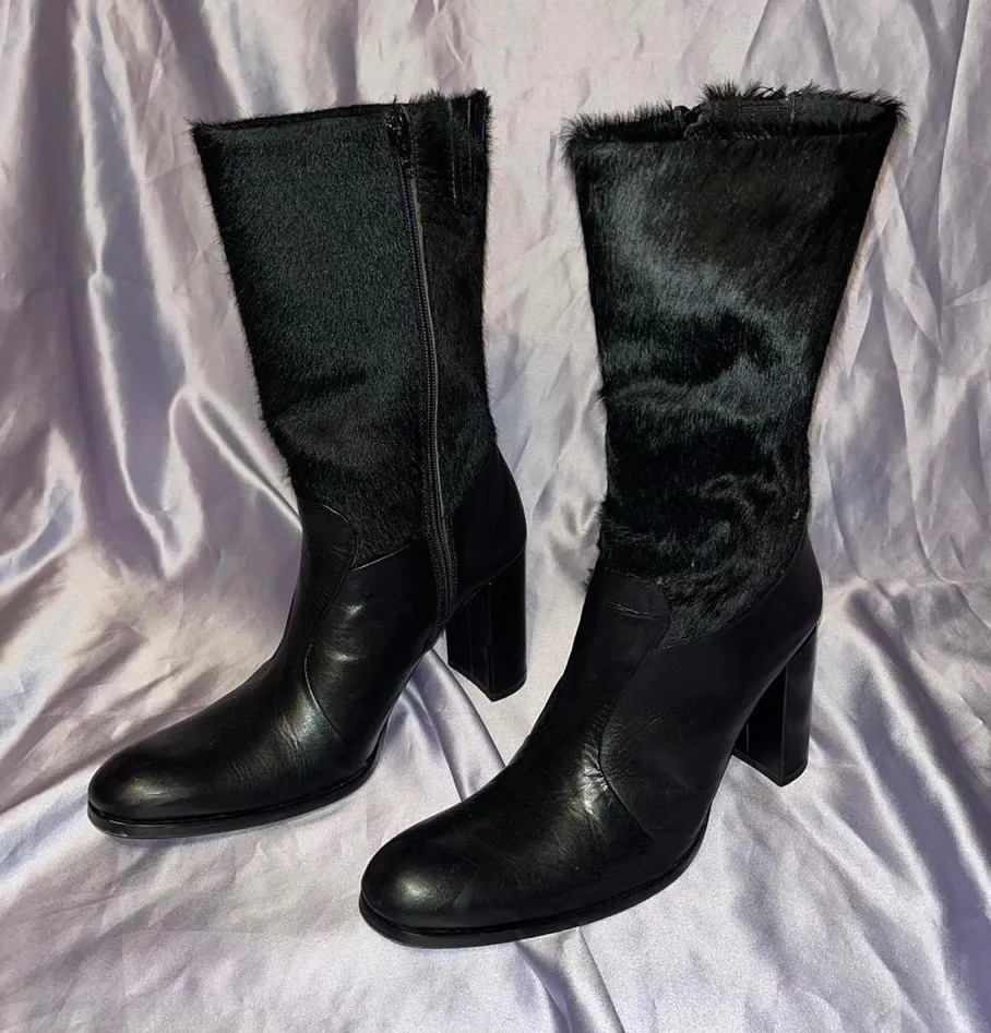 Black Italian leather heeled calf high boot hair upper pointed toe zip up sexy Size 8 - $155 - From Kristal