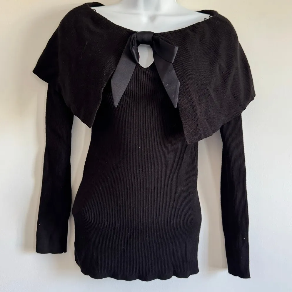 Add a touch of elegance to your wardrobe with this unique women’s ribbed knit sweater top. Designed with a dramatic cape-style overlay and an attached bow tie front, this piece combines classic chic with modern detail. Perfect for pairing with trousers, skirts, or denim for a sophisticated look. • Size: XS / XP • Color: Black • Material: 74% Rayon, 26% Nylon (Exclusive of decoration) • Features: • Ribbed knit body • Long sleeves • Dramatic cape collar overlay • Bow tie accent at neckline • Stretchy, form-fitting fabric • Approximate Measurements (flat lay): • Length: 23.5” • Bust (pit to pit): 14.5–15” (stretches) • Sleeve length: standard long sleeve • Condition: Gently pre-owned, in very good condition. No holes or stains. Some light lint present, will be cleaned before shipping. Style Notes: This sweater top is versatile enough for both casual and dressy occasions. The bow-tie detail adds a feminine touch, while the cape overlay makes it stand out from ordinary knits.