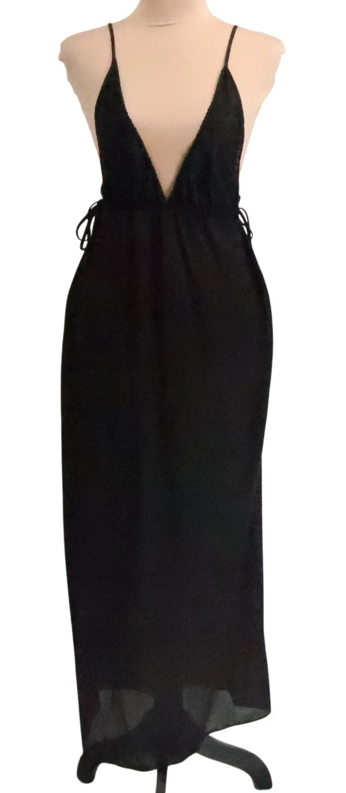 Whimsigoth, party, lingerie, sexy, date night 100% Nylon, deep v-neck, spaghetti straps, side ties for fit adjustment Condition: Good pre-owned condition. One small place where lace needs to be reattached to strap and one stripe of stitching detail on bust is coming out. (see photos) Measurements in photos – please review measurements prior to purchase to ensure fit. Measurements: • Pit to Pit (under bust): 11 in • Waist (under ties): 19 in • Length: 54.5 in Please note: Color may vary slightly due to lighting and screen differences. Offers welcome!