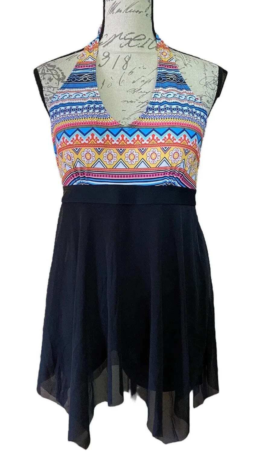 * Brand new * One piece bathing suit with semi sheer skirt * Size XL * Halter style top * Ties around the neck * Pull on * Softly molded cups * Under the skirt is black shorts * One piece * Brand new but there are no tags attached