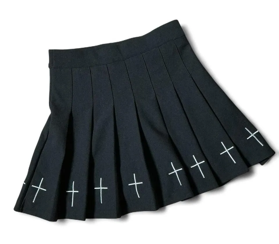 Black pleated mini skirt with white embroidered cross details. This stylish skirt features a flattering pleated design and a subtle yet striking cross pattern along the hemline. Perfect for creating edgy outfits, this skirt is ideal for concerts, casual outings, or expressing a unique personal style. Keywords: pleated skirt, mini skirt, goth, punk, alt fashion, streetwear, cross print, dark academia, emo, kawaii, alternative, edgy, y2k All clothing are cross posted, #Whimsigoth #Festival