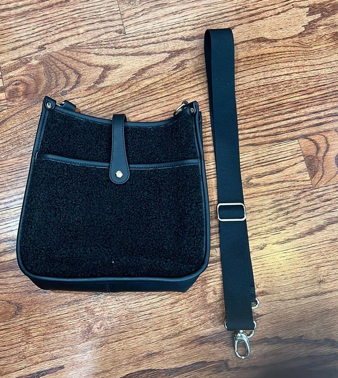 Black plush crossbody Unsure if brand no label or tags Gold hardware Comes with black adjustable strap 1-outside pocket 3-inside pockets Like new-never used See pictures for measurements