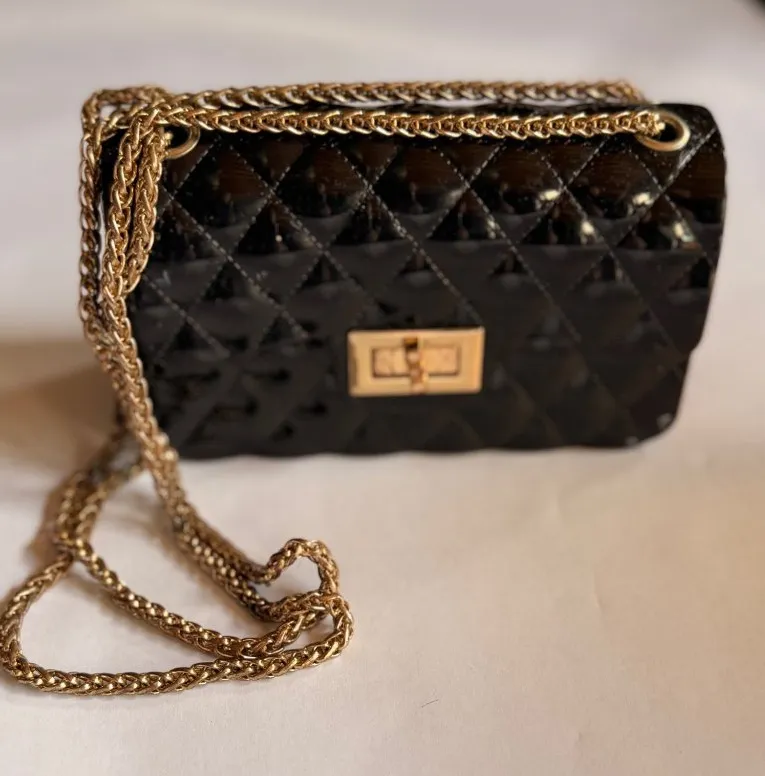 Elevate your style with this sleek crossbody bag. The glossy quilted design and gold-tone accents add sophistication, while the chain strap offers versatility. • Quilted Jelly • Gold-tone turn-lock closure • Chain shoulder strap • Compact interior with divider • Made in China Minor scuffs on the interior lining, not visible from the exterior. Height = 5 inches, Width = 7 inches, Depth = 2.5 inches.