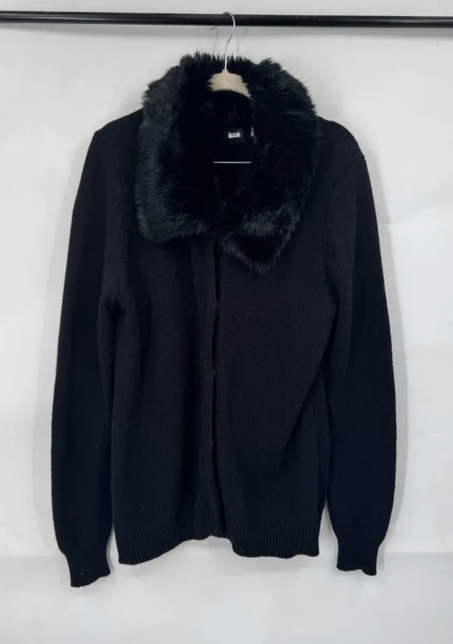 Great pre owned condition with mild wear to the knit. Size xl. Snap front. Faux fur trim neckline, All measurements are approximate: 19 inches pit to pit. 21 inch sleeve from cuff to pit. 30 inch length from shoulder to bottom hem. G32