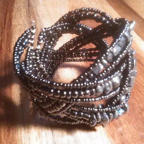 This substantial bracelet features a mulit-row design of black seed beads and varied shape black stones. At its widest point, the bracelet measures approximately two inches. It has a cuff style that is stretchable for easy put on and off. Brand new. B11