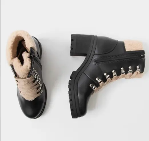 These Knit lug boot, Features a vegan leather upper. Lace up with a side zip for easy on and off. Knit insert detail with silver accent stylish city streets in the plush shepra collar detailing and chunky platform block heel profile. 2-1/2" block heel; 1" platform Round-toe lace-up platform boots Functional Side zipper Shepra collar and lining Vegan leather upper; acrylic faux-fur; man made sole Truer to size