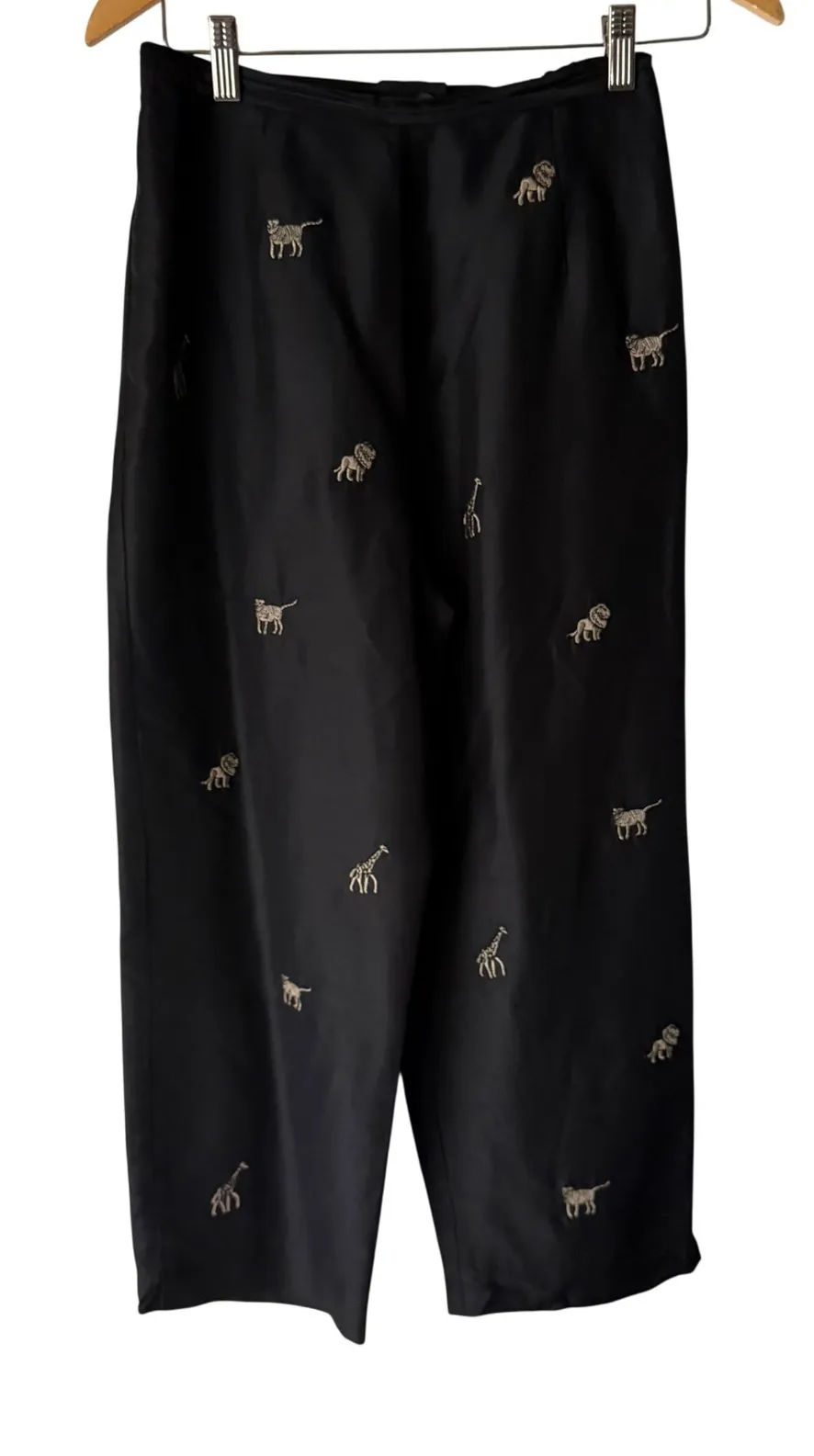 Measurements: • Waist: 26 in • Inseam: 25 in High Rise Style: Dress Pants Department: Women Material: Silk, Polyester Leg Style: Straight Type: Pants Fabric Type: Silk Features: Lightweight, Wrinkle Resistant Closure: Pull On Pattern: Animal Print Accents: Embroidered Theme: Nature Occasion: Casual, Travel Fit: Classic Keywords: silk blend pants, embroidered pants, safari print, animal print, designer pants, wide leg pants, casual pants, evening pants, statement pants, linen pants, chino pants, denim pants FAQS: We ship out items every 1-2 days due to high volume shipping the mail carrier does not scan the items until it reaches the next facility.This can take up to 48+Hours for tracking to update. We provide measurements in the photos as well as the descriptions. We add as many details as possible until the item is put into inventory. We are unable to take the item out of inventory for additional information. Due to a high volume store we are unable to answer these questions individually.