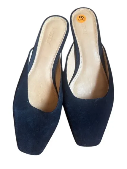 Black suede square toe mules. These elegant slip-on shoes feature a refined silhouette with a pointed toe and a low heel, perfect for versatile styling. The clean design and comfortable slip-on construction make them a chic addition to any wardrobe. Measurements: • Sole length: 10.5 inches • Sole width at widest point: 3.25 inches Style: Slip-On Department: Women Upper Material: Suede Features: Cushioned, Padded, Non-Slip Occasion: Business, Workwear, Casual, Travel, Party/Cocktail Insole Material: Suede Lining Material: Leather Outsole Material: Faux Leather Type: Flat Keywords: black mules, suede flats, square toe shoes, womens size 8.5, pointed toe mules, slip on shoes, low heel flats, elegant flats, dressy mules, casual flats, designer mules, fashion shoes, womens footwear