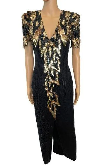 Black Tie Size 4 Measurements are Approximate Pit to Pit 19” Waist 14” Shoulder to Hem 53” 100% Silk Shell Regal Black and Gold Intricate Stunning Beading and Sequins Sexy Sultry Plunging V Neck Shoulder Pads for Structured Look Edgy Short Sleeves Circular Exposed Back Cutout Hidden Back Zipper Hook and Eye Top Closure in Back Higher Slit Rounded Hem Lined Elegant Timeless Midi Length Gaudy Glitz Glam Hollywood Formal Special Occasion Preowned - there are spots of missing beads and sequins and overall wear. For such a heavily beaded and sequin dress, this is to be expected. Selling as is!