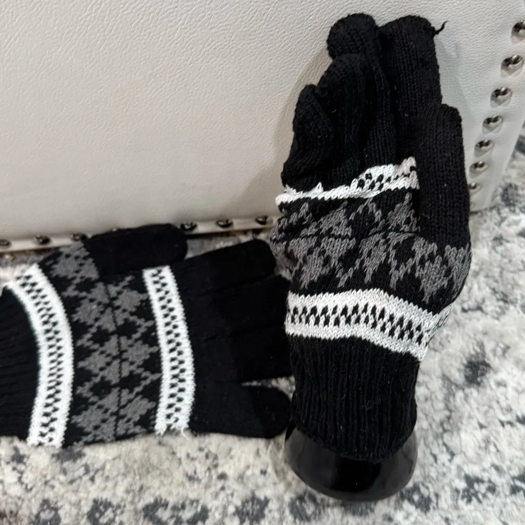 Black Unisex Nordic Snowflake Knit Gloves These are knit winter gloves featuring a black, white, and grey Nordic snowflake pattern. • Design: The black gloves have a distinct pattern, described as a snowflake design. • Material: Gloves are made from polyester & spandex to provide warmth and a comfortable, stretchy fit.