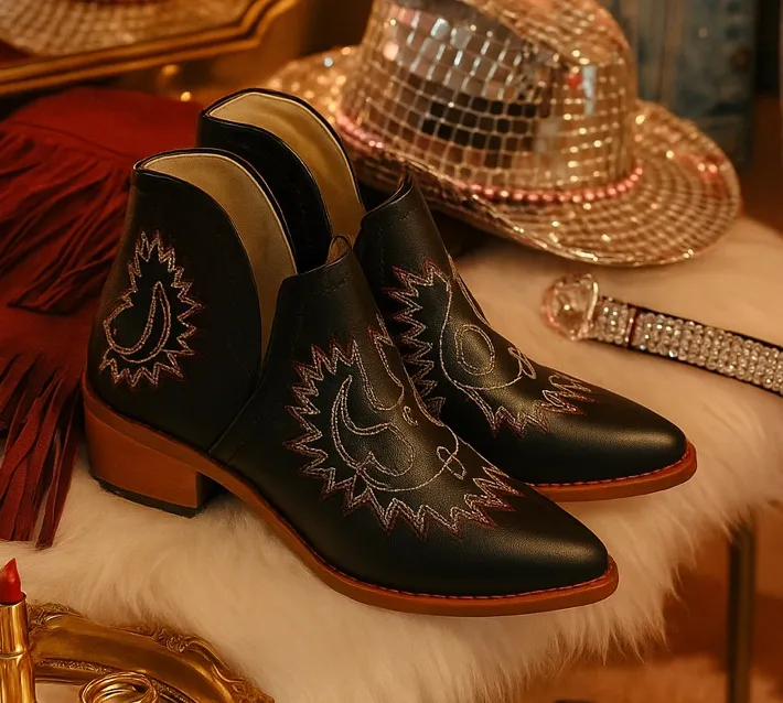 Giddy up glam with these statement black western ankle booties, designed to bring bold cowgirl attitude with a modern edge. Featuring striking white and burgundy embroidery in a flame-inspired western motif, these boots are perfect for concerts, festivals, or elevating everyday outfits. The pointed toe delivers classic western flair, while the sturdy block heel provides comfortable lift and all-day wearability. Side cutouts create a flattering ankle-hugging silhouette that pairs effortlessly with denim, dresses, or fringe skirts. Finished with a rich tan sole and cushioned interior for style and comfort. • Color: Black with white & burgundy embroidery • Style: Western ankle booties / cowgirl boots • Toe: Pointed • Heel: Block heel approx. 2.1” (55mm) • Closure: Pull-on with side dips • Condition: Brand New With Tags (NWT) • Size: US Women’s 8.5 (EU 39 / UK 4 / AU 5) Perfect for rodeo season, country concerts, Nashville looks, or adding western glam to city outfits. #WesternBooties #CowgirlBoots #WesternAnkleBoots #PointedToeBoots #BlockHeelBoots #EmbroideredBoots #BlackBoots #CountryConcertStyle #WesternChic #ModernCowgirl #FestivalBoots #BoutiqueFind #NWT #Size85 #FallFashion #StatementBoots #CoquetteCowgirl