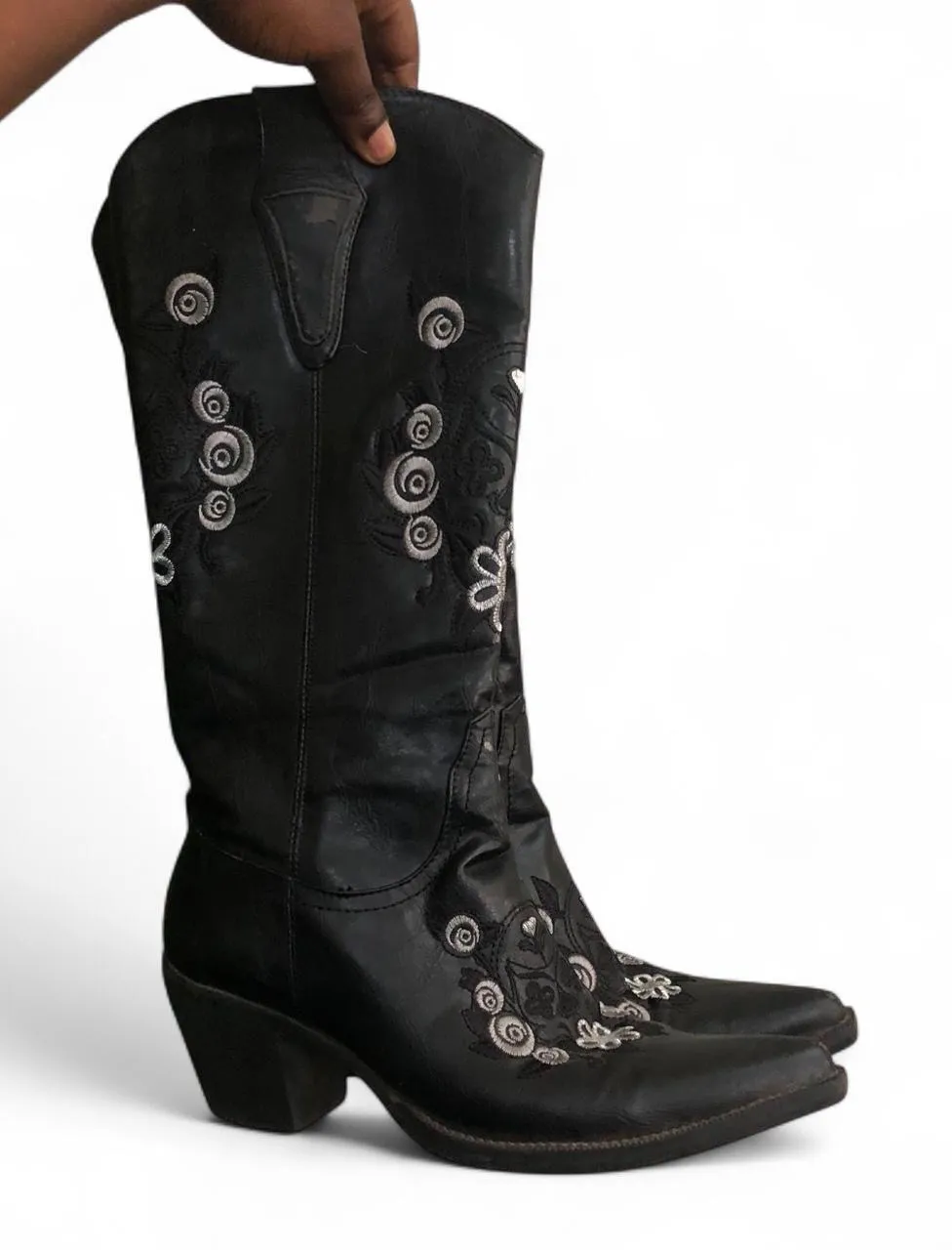 Black White Embroidered Floral cowboy western boho leather boots pointed toe mid calf #hippie #indie #gothic #fairycore-US Women 6 - $103 (95% Off Retail) - From Victoria