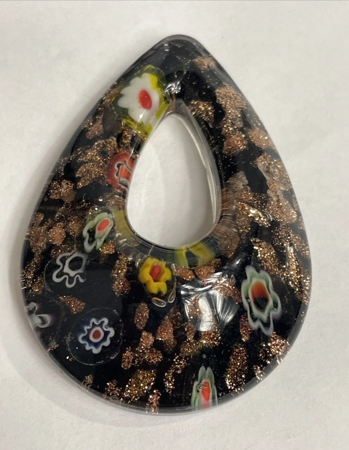 This Black with Gold 48x31 mm Open Teardrop Donut Millefiori Glass Pendant is a unique and stylish p... Show more