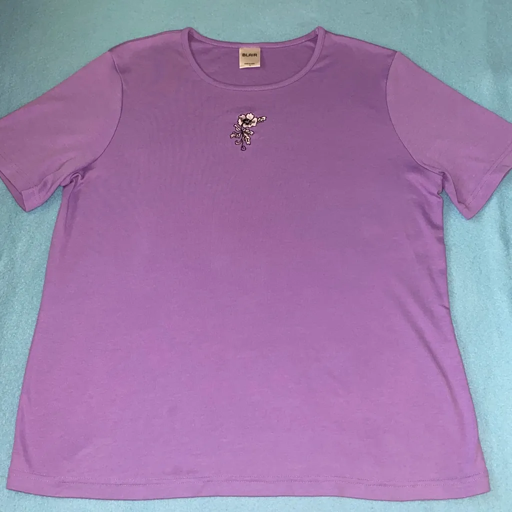 BLAIR floral embroidered short sleeve round neckline top. Comfy purple top with intricate floral embroidery. Ideal for versatile styling. Matching pinstripe over shirt is available in my closet too. NEW without tags - No visible flaws 40% cotton 40% polyester SZ L Excellent Condition
