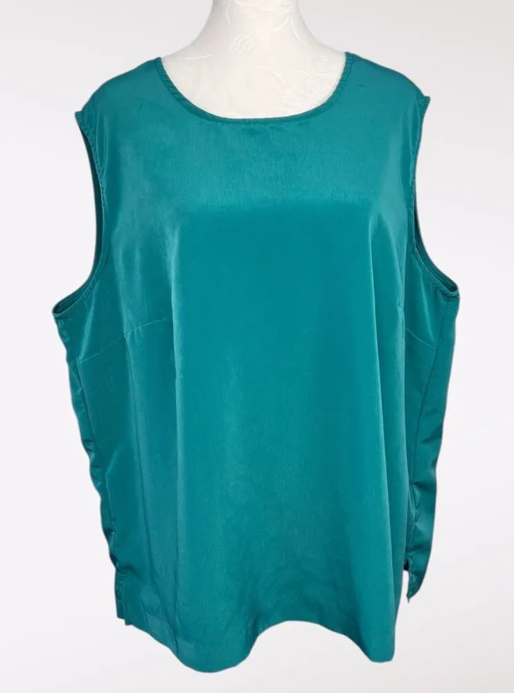 Vintage late 1990s Blair sleeveless blouse in jade green with a smooth woven finish and scoop neckline. • Scoop neck sleeveless blouse • Lightweight silky polyester • Relaxed fit, great for layering • 100% polyester very good condition, SEE PHOTOS • there are light dark spot on fabric, seems like "water spots" no holes, no tears, no stains SIZE XL measurements – laid flat shoulders: 16.5" bust: (pit to pit) 24" length (shoulder to hem): 26.3" bottom hem (laid flat + across): 26"