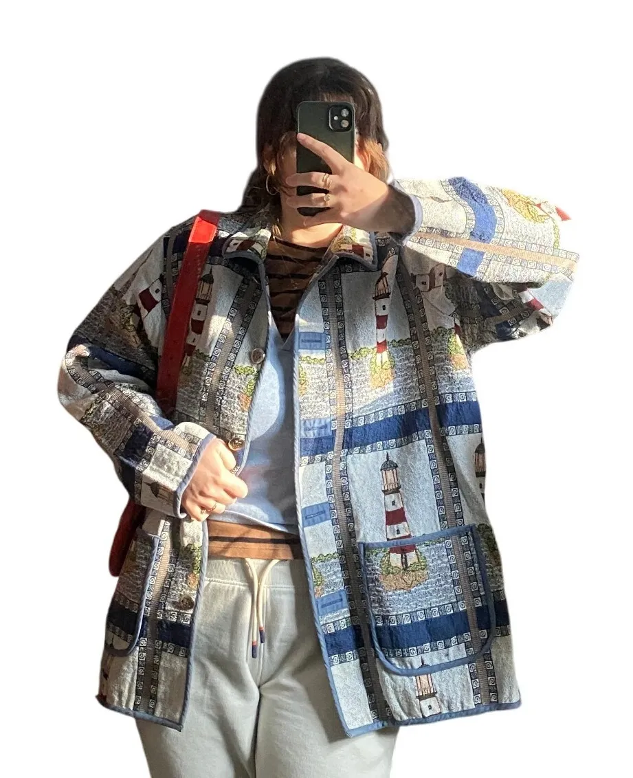 Vintage Lighthouse Textured Overcoat 2X Heritage Woods Fisherman Whimsical Grandpacore Oversized cozy textured embroidery style ocean nautical lighthouse pattern collared jacket with big front pockets and round silver anchor buttons. In excellent condition. Pair with cuffed pants and a cable knit sweater for a heritage woods meets fisherman grandpa aesthetic. Plus size, pea coat, layering, winter, holiday, cotton, natural fibers, rug texture, dark age, artsy, scandi, 90s, ralph lauren christmas, j crew
