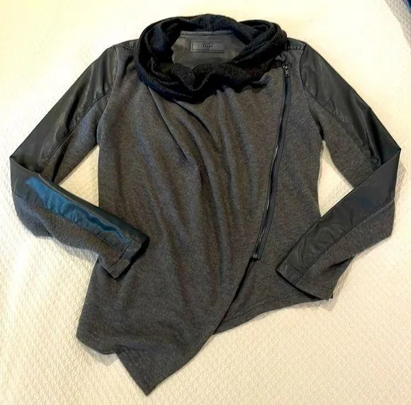 BlankNYC drape front asymmetrical jacket with leather sleeves and back. Side zip with lightweight kn... Show more