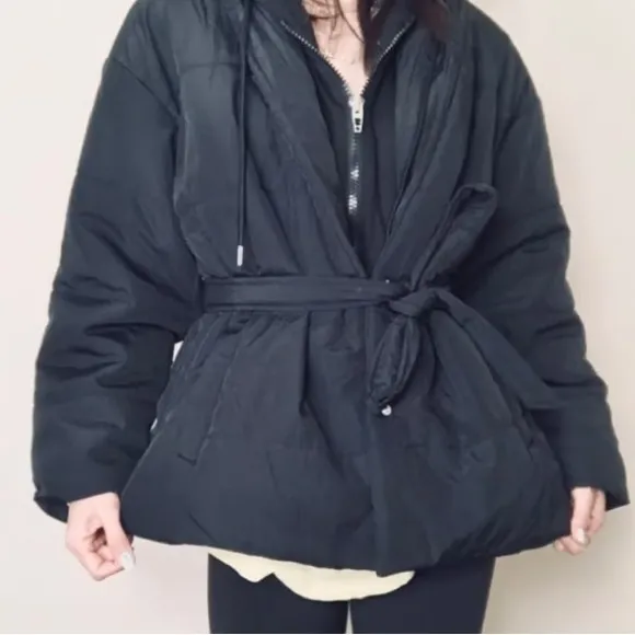 Chic black puffer with a belted waist. Cozy and stylish for cold days. Runs a bit big Can remove h... Show more