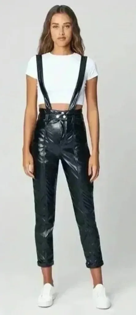 . High rise. slim cut leg. suspender style straps for an overalls look, which can be removed so that... Show more