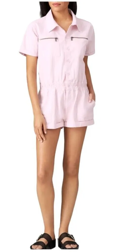 Easy to dress up and down, this versatile light pink BlankNYC romper combines trend-right utilitarian touches with an effortless elastic waist in stretch denim.