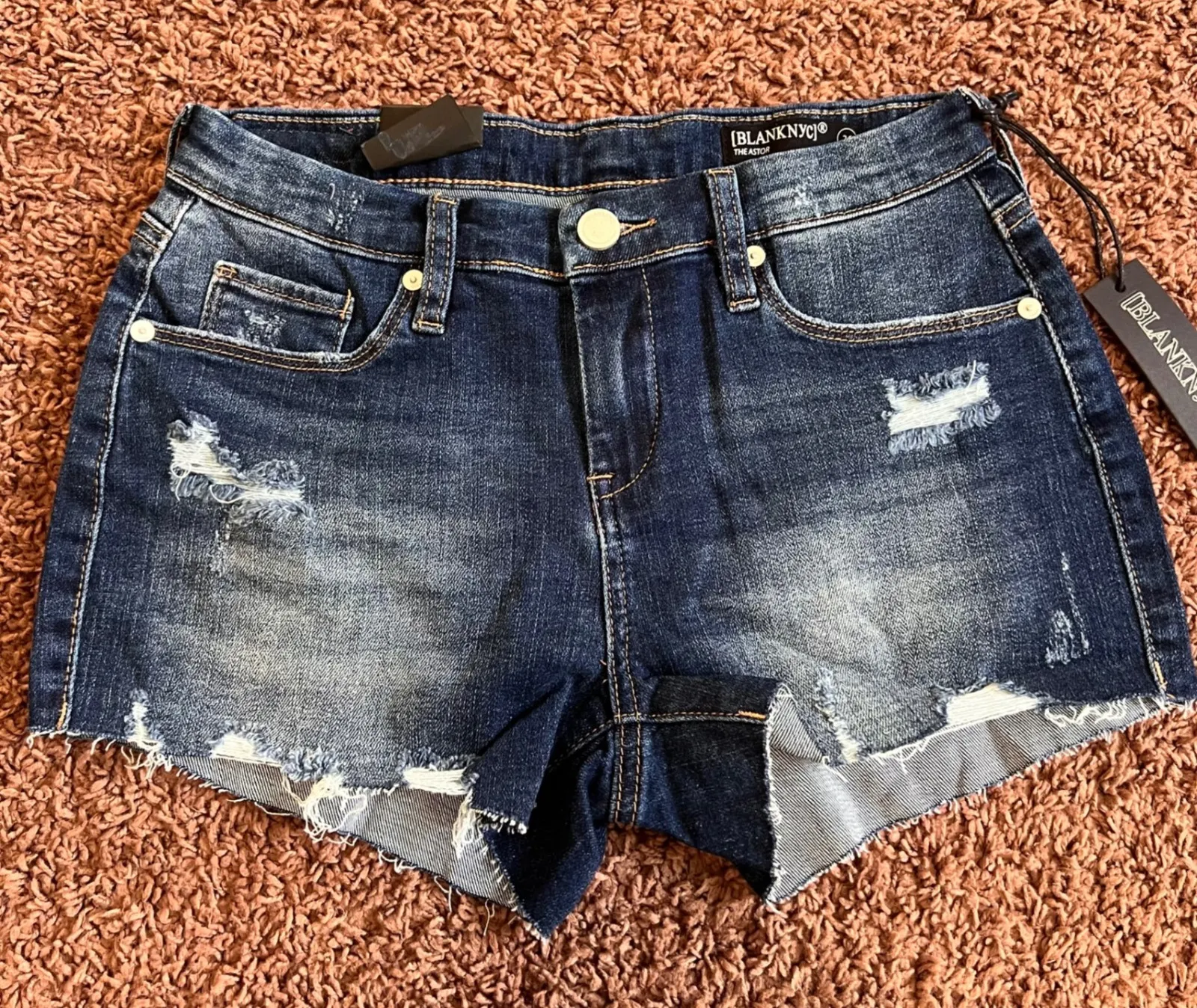 Keywords: [BLANKNYC], denim shorts, distressed shorts, raw hem shorts, dark wash shorts, women's shorts, size 26, casual shorts, summer shorts, fashion shorts, stylish shorts, blue denim, new with tags