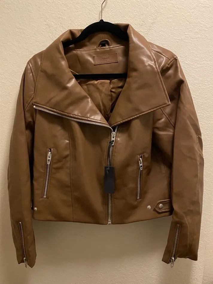 Beautiful brand new faux leather Moto style jacket. Has front pockets. Sleeves have zippers that can... Show more