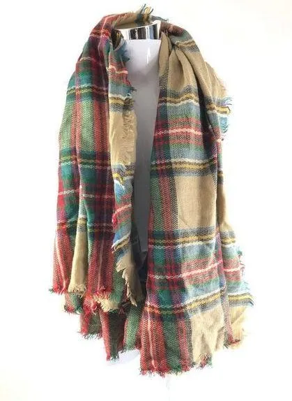 Blanket Scarf Square Tapestry Plaid Fringe Beige Red Green Square 57x53 - $16 - From Jen
