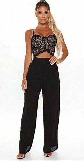 Blashe black lace jumpsuit! Top has lining in front and open sheer in back! Pants have elastic back... Show more