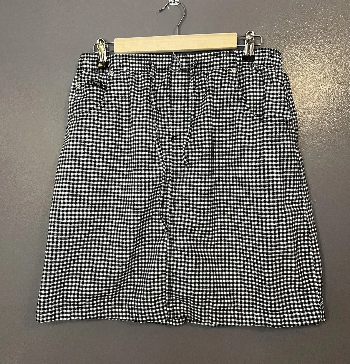 Gently worn with light overall wash wear. Fabric is clean and intact with no stains, holes, or fraying. Elastic waistband stretches well and pockets and seams are secure. Brand: Blassport Style: Womens casual Skirt in a black and white gingham check pattern with a relaxed fit. Color: Black and white Size on tag: 10P (Petite) Materials: 100% cotton Made in Sri Lanka; RN 96157. Details: Elastic waistband, pull-on style, front hand pockets, back patch pockets with Blassport classic casuals logo tag, lightweight woven fabric ideal for warm weather. Care: Machine wash cold with like colors, non-chlorine bleach when needed, tumble dry low, warm iron when needed. Waist 28" stretches to about 36" Length 19.5" 2345