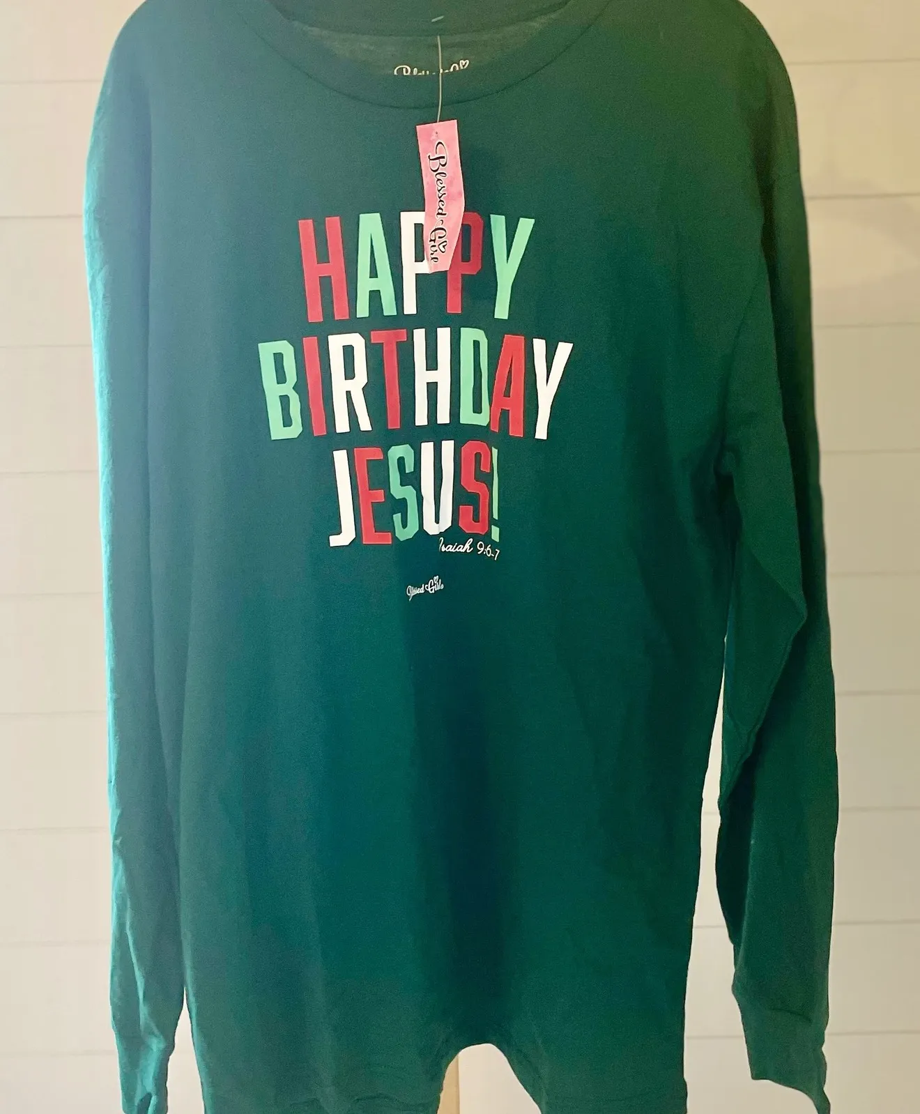 Celebrate faith and holiday spirit with this uplifting Blessed Girl long sleeve t-shirt. Bold red, white, and green lettering proudly proclaims Happy Birthday Jesus, with a gentle nod to Isaiah 9:6-7, creating a heartwarming message that resonates deeply. The rich forest green hue serves as a beautiful backdrop, perfect for capturing the joy of the season and expressing your devotion. Type: T-Shirt Department: Unisex Adults Style: Basic Material: Cotton Blend, Polyester Neckline: Crew Neck Sleeve Length: Long Sleeve Sleeve Type: Classic/Fitted Sleeve Pattern: Solid Theme: Birthday, Holiday Features: Tagless Fit: Regular Fabric Type: Jersey Occasion: Casual Closure: Pullover Keywords: faith, religious, holiday, seasonal, inspirational, Christian, Christmastime, casual, crew neck, graphic tee, long sleeve, scripture, devotional