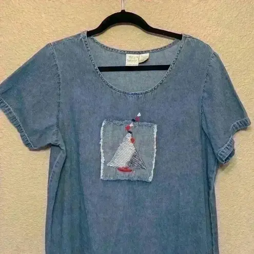 Bleu Bayou denim maxi dress sz L Approximate measurements Pit to pit: 21” Length: 48.5” Style tags: 90s vintage sailboat nautical grandma dress up Halloween nautical denim dress jean dress maxi modest natural fibers 100% cotton