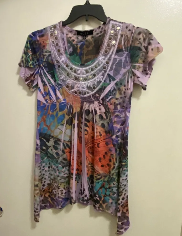 Eye-catching top with a bold butterfly design. Features vibrant colors and short sleeves. Soft cotton blend fabric - semi sheer Excellent condition with no fading, wear, stains or damages Pit to pit is 17” across for bust measurement of 34” Length 26” in front and 34” on sides Sharkbite bottom hem with sides longer than front and back