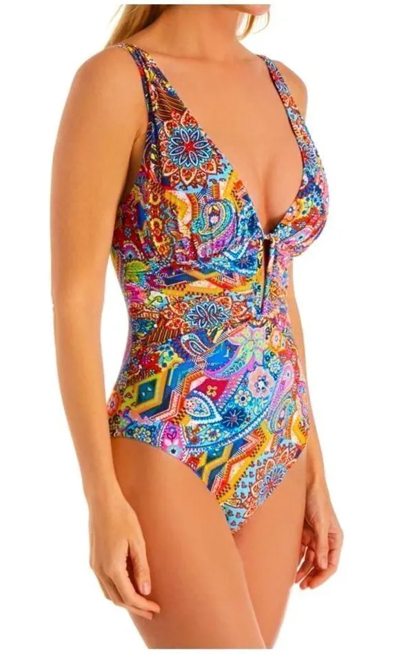 Feel fabulous and comfortable in this one-piece swimsuit, featuring a shirred front, V-wire, molded cups, thigh-concealing design, and a lovely paisley print. By Bleu Rod Beattie. Details Shirred front for style. V-wire and molded cups for support. Thigh-concealing design. Paisley print. 87% nylon, 13% spandex. Hand wash. Imported.