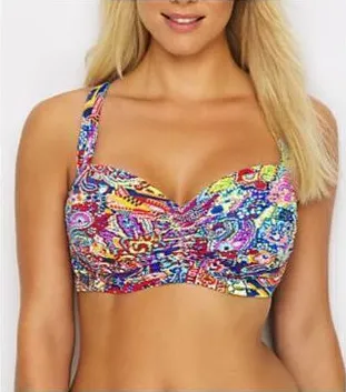 Looking for a suit that is supportive and chic? The Bleu Rod Beattie invisible underwire shirred swim top is a modern look with a twist. Constructed with center front shirring detail, underwire, cross over back adjustable straps, and hook and loop closure for a truly customized fit. I had to list as a size 18 W because it does not take bra sizes. But it is mixed. 40D-top/18W-bottom Product Details Hook and loop closure Deep sweetheart neck Adjustable straps Underwire Lined Bottom: Feel confident in this flirty, paisley print bikini bottom Sarong inspired faux fold-over waistband Quality lined stretch microfiber Imported
