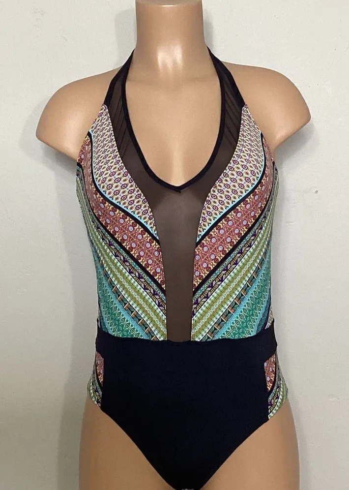 New. BLEU Rod Beattie plunge neck swimsuit. Plunging v-neck mesh halter one piece swimsuit that ties behind neck. Beautiful high quality fabric. Bright colors of aqua, pink, green, black and gold. Love the design. BIN4