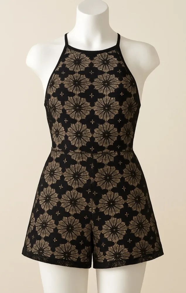 Blue Ciel — known for modern romantic pieces with a flattering fit. Whimsigoth, Dark Romance, Flirty, Lace, Floral Romantic goth black floral lace romper with nude lining that gives the illusion of a mini dress. Features a halter neckline, spaghetti straps, and a hidden back zipper. Ideal for cocktail & holiday parties, evening events, date nights, parties, and the holiday season. Perfect for cocktail parties, holiday events, girls’ night out, or semi-formal gatherings. Combines comfort and elegance — easy to move in while maintaining a polished, Whimsy Goth aesthetic. Details: • Brand: Bleuh Ciel • Size: Large • Color: Black with nude/tan lining • Fabric: Polyester blend • Closure: Hidden back zipper • Lined: Yes (fully lined for comfort and opacity) • Condition: Excellent pre-owned • Original Retail: Approx. $68 • Smoke-free home Whimsy Goth • Date Night • Party • Holiday • Going Out • Lace • Romantic #WhimsyGoth #BleuhCiel #LaceRomper #BlackLace #FloralLace #HolidayOutfit #NightOut #RomperDress #QuietLuxury #DarkRomance #ClassicStyle (190)