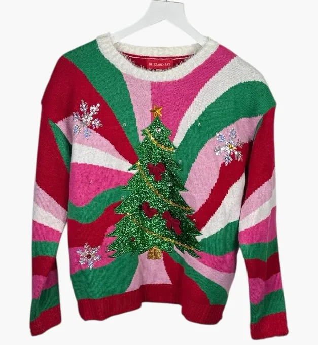 Blizzard Bay Sweater Christmas Holiday Light Up Ugly Sweater Blinking lights is functional and can be turned off and on by switch which is stored inside in a pocket Bows, sequins, sparkle and of course lights New with Tag Underarm to underarm approximately 20”. Top of shoulder to bottom hem approximately 24”. W2057