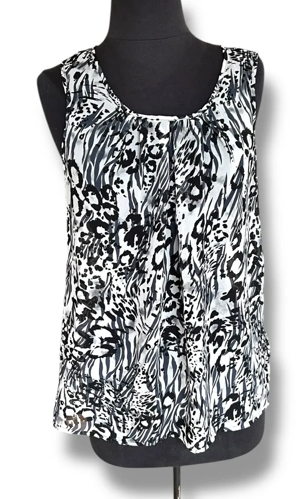 Blk/Lt Gray/White Print Sheer Sleeveless Front Pleats Front pleats at center of neckline 1 Button closing in back Size tag missing, measures approximately as a medium Measurements are approximate and done with item lying flat. I ship same day or next day. Please be sure to ask any question you may have about this top that I may have missed