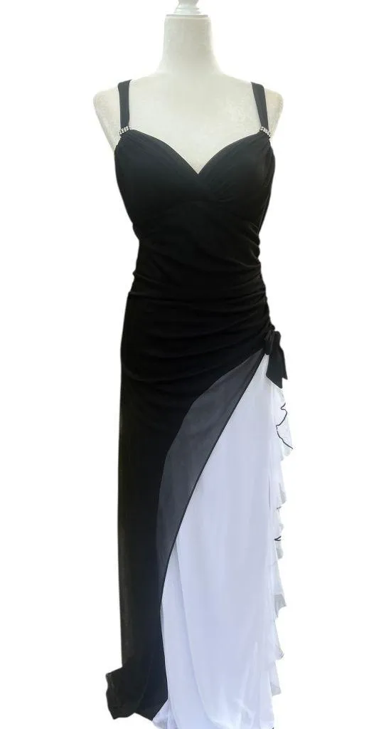 90s/Y2K Two-Tone Gown <3 Sweetheart neckline, ruched bodice, rhinestone accents on the straps, & asymmetrical layered skirt in black and white with a small bow on the side Brand: Blondie Nites Size 13 Pit to pit 16.5 in Waist 28 in Hips 40 in Length 56 in 90s y2k prom homecoming goth glam femme fatale cocktail scrappy evening wear wedding guest mall goth retro princess whimsy