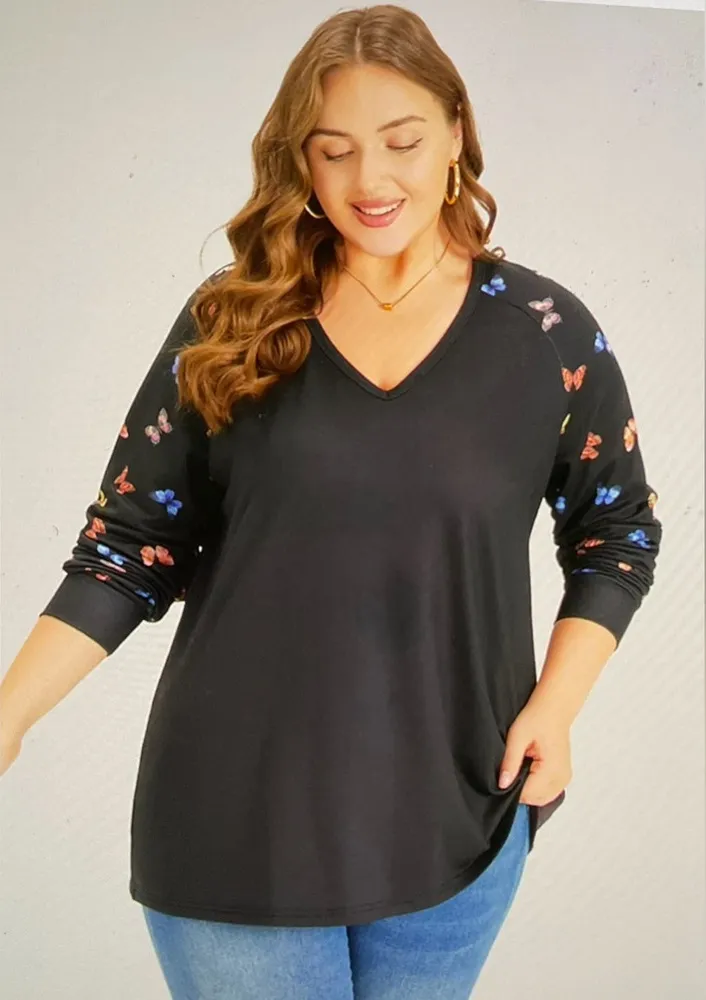 BloomChic Blk V-Neck Top with Butterfly Print Sleeves.P2P 27-30” SUZE 18/20 NWT Black Size undefined - $20 New With Tags - From Linda